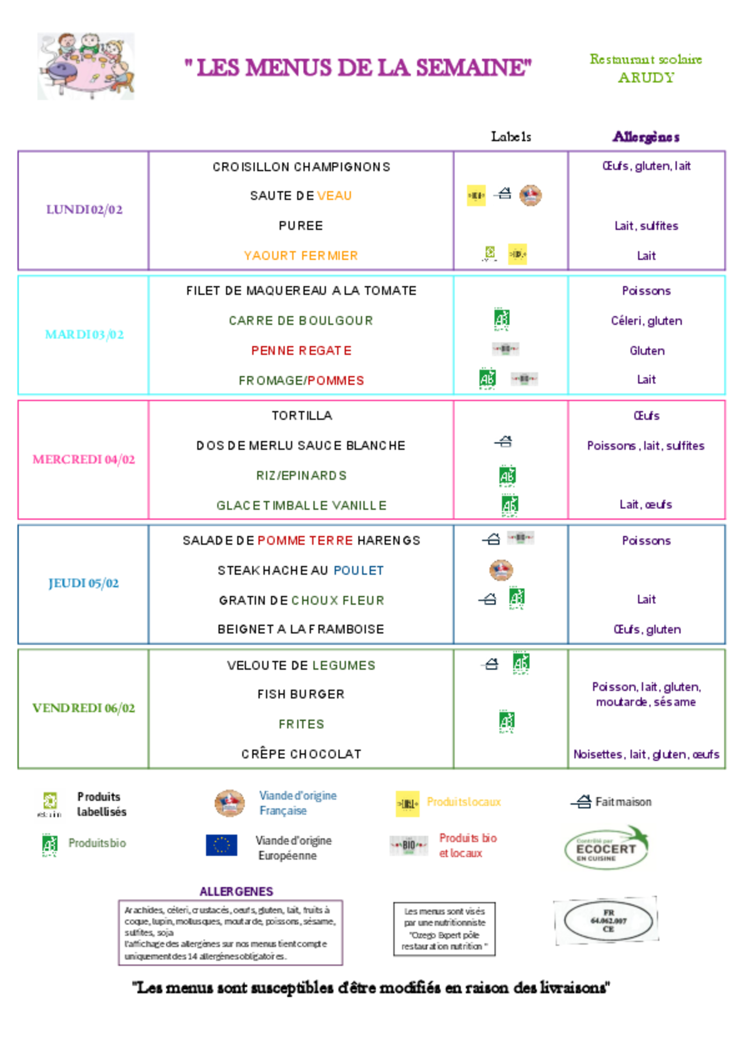 Menus du 02 au 06 Février