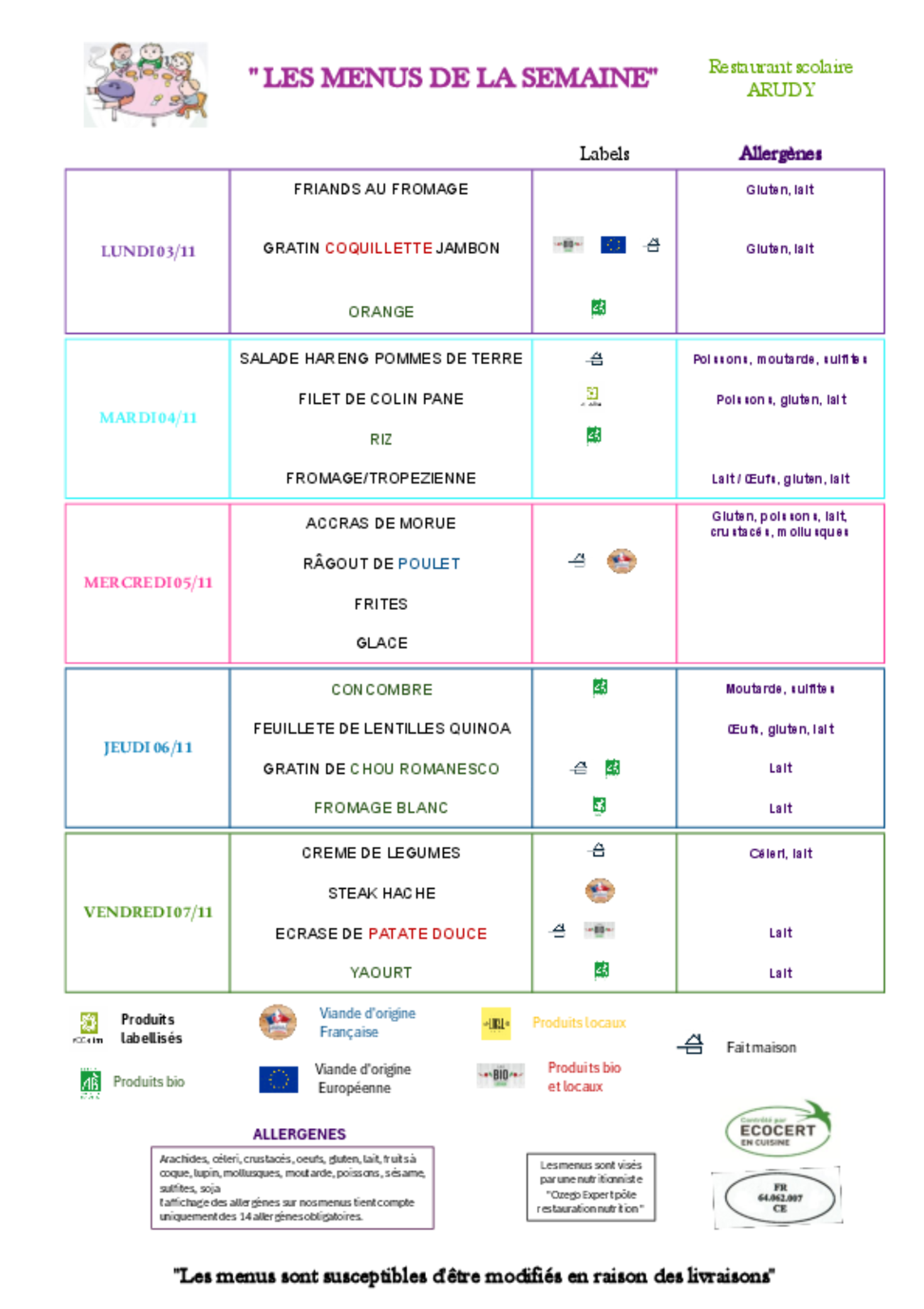 Menus du 03 au 07 Novembre