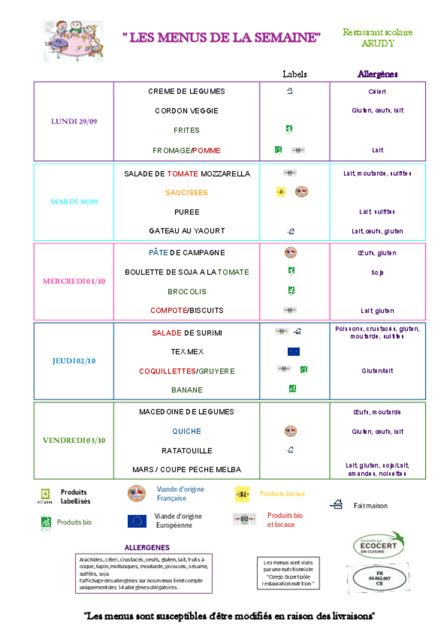 Menus du 29 au 03 Octobre